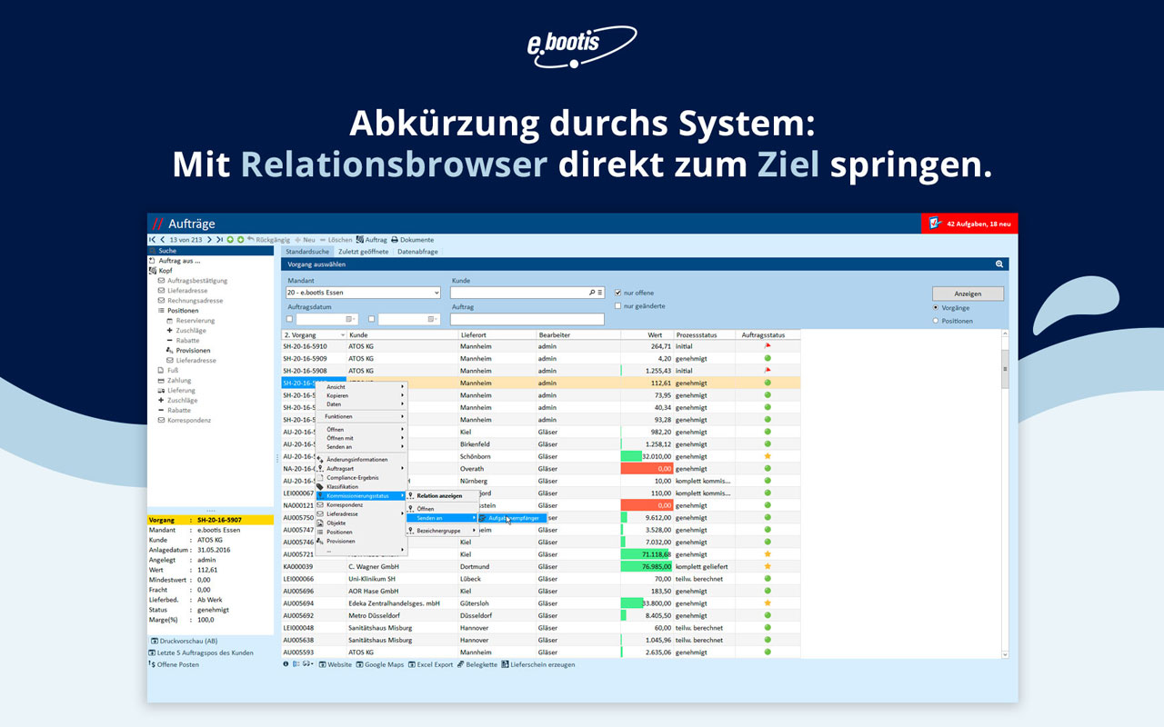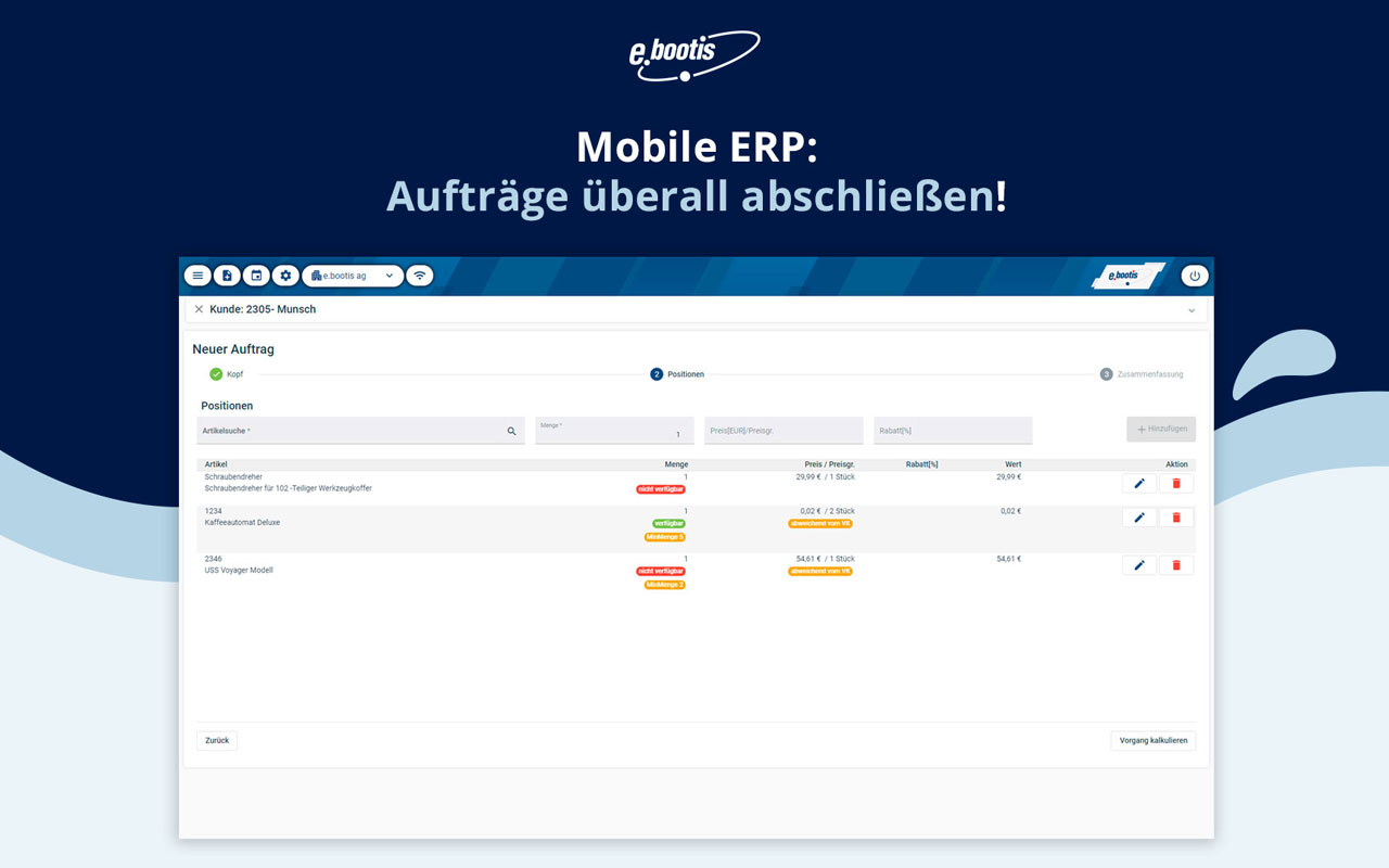 Funktional deckt ebootis ERP alle zentralen Unternehmensbereiche integriert ab – von Einkauf, Vertrieb, Lager und Produktion über Service bis hin zu Finanz- und Personalwesen. Das ERP-System ist vollständig mandantenfähig und bildet auch komplexe Unternehmensstrukturen ab.