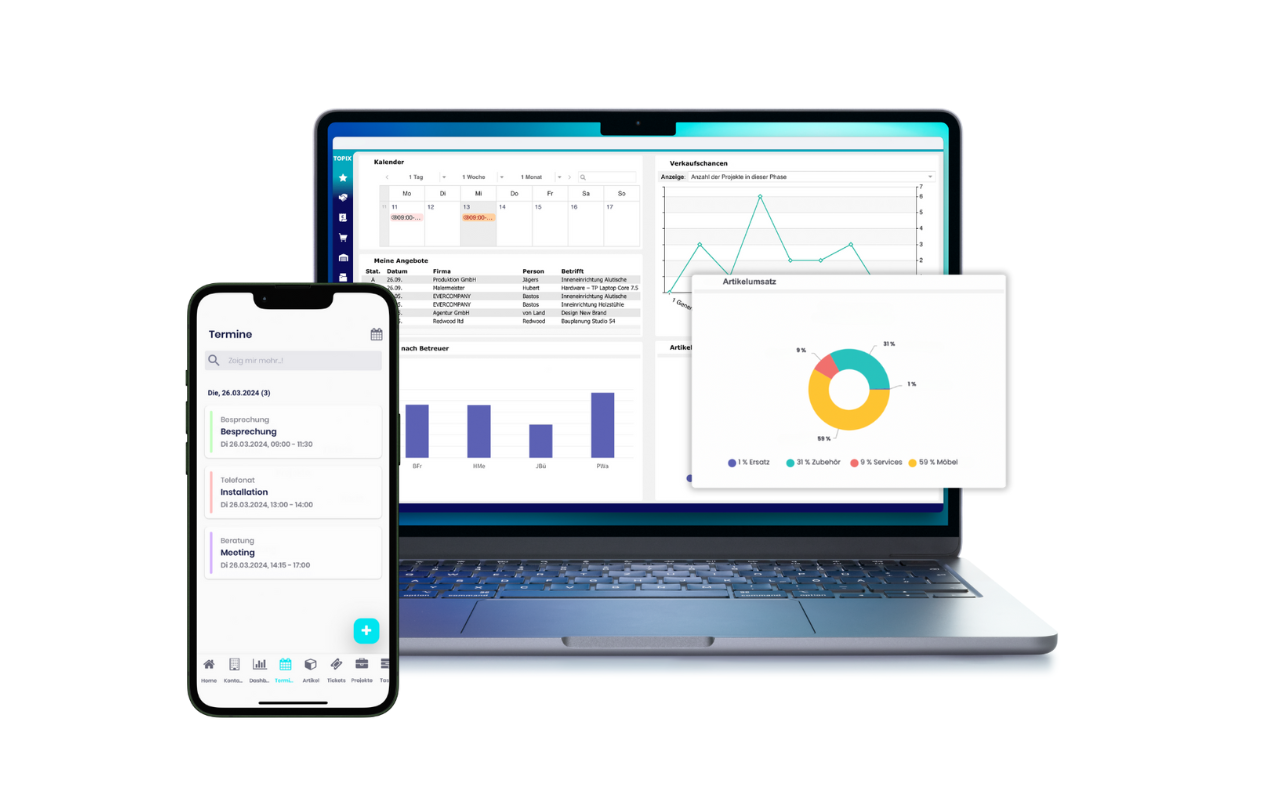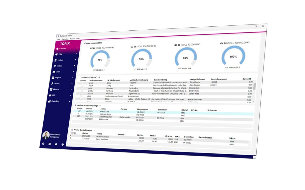 Besonders stark ist TOPIX im Zusammenspiel der Bereiche: CRM, Finance und HR arbeiten auf derselben Plattform und Datenbasis. So greifen Kontakt- und Verkaufsdaten, Belege, Zahlungen und Auswertungen nahtlos ineinander – ohne doppelte Pflege und mit verlässlichem Reporting. Ergänzend stehen branchenspezifische Erweiterungen bereit, z. B. für Vermietung, Service-/Ticketprozesse, Vertragsverwaltung und Projektmanagement sowie Schnittstellen für Versand/Logistik und Finanzexporte.