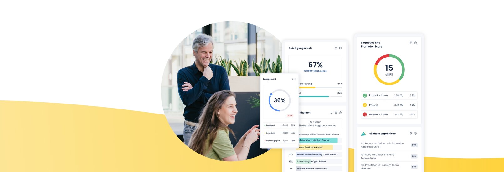 Unsere Plattformlösung ermöglicht es, Mitarbeiterfeedback zu wichtigen Businessfaktoren wie Führung, Engagement, Bindung, psychischer Gesundheit, ESG, DEI und viele weitere zu sammeln, mit validen Benchmarks zu vergleichen und in konkrete Maßnahmen für Ihre Organisation zu übersetzen. Unsere Plattform verfügt über Schnittstellen zu mehr als 30 HR-Systemen und ermöglicht Befragungen in 60 Sprachen.