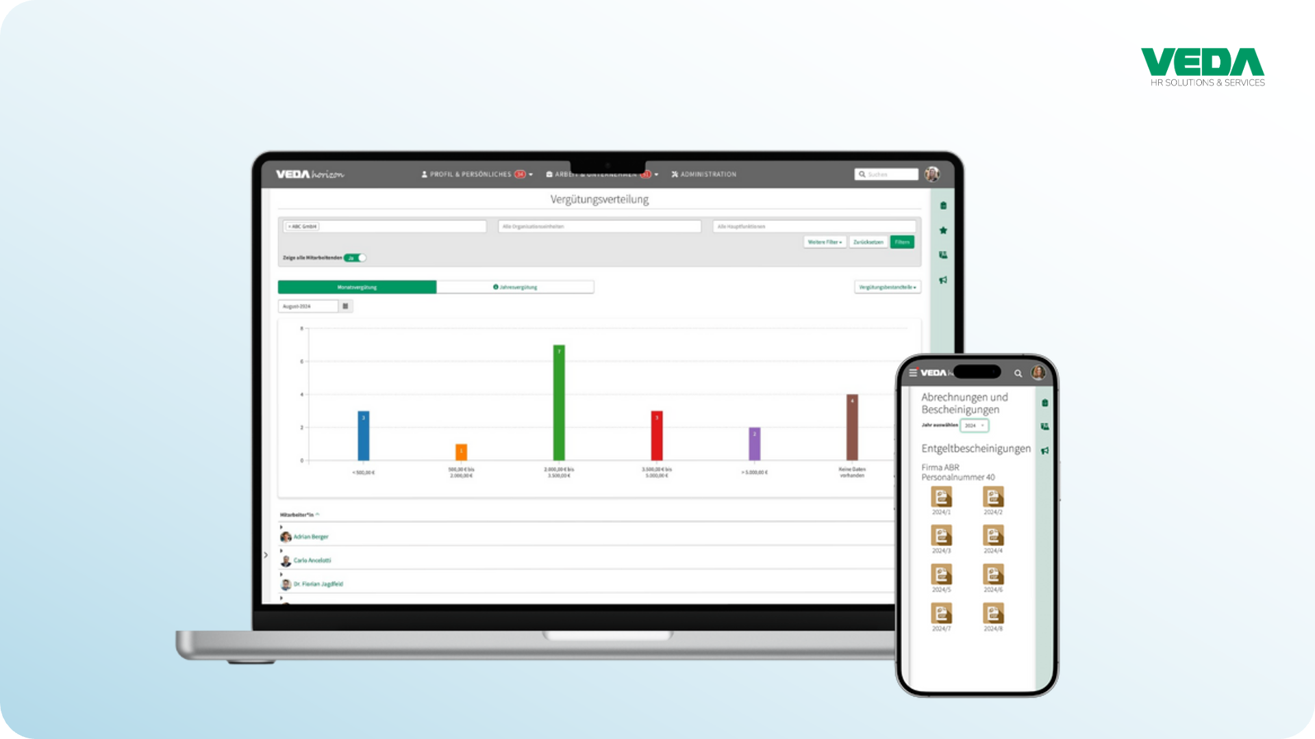 Navigieren Sie sicher durch komplexe Entgeltthemen mit intelligenten Prozessen, Self Services, einfachem Reporting und schnellen Abrechnungsläufen. In Kombination mit VEDA Horizon People Management steuern Sie wichtige Workflows mobil.